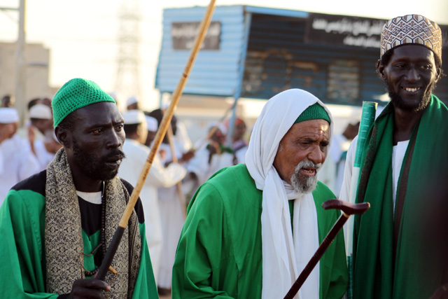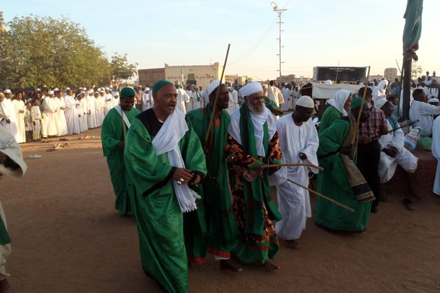 De in het wit geklede Sudanese mannen staan in een kring om de volgelingen heen. Ze klappen en stampen op het ritme mee. De vrouwen zitten en staan dichtbij de moskee zelf, gekleed in kleurrijke doeken. Toeristen lopen er tussendoor.